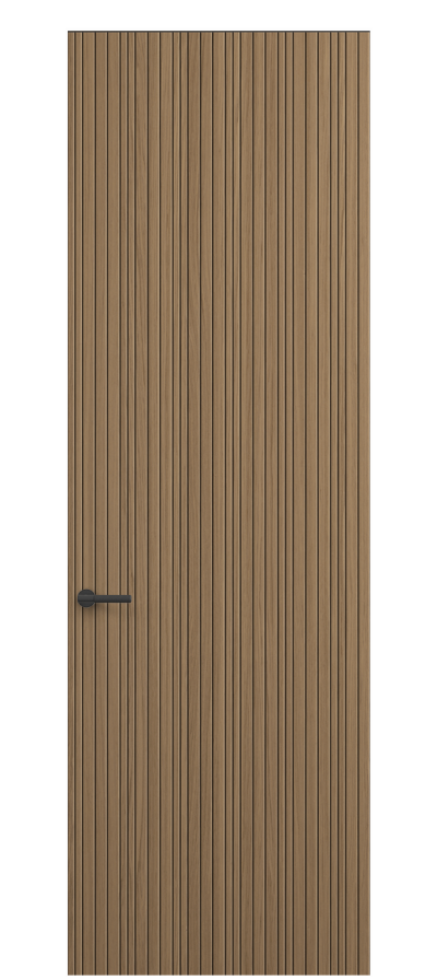 Селект — коллекция минималистичных дверей с фрезеровкой по натуральному шпону. Рельеф на поверхности полотна создаёт игру света и тени, добавляя пространству динамичности и визуального объёма. Двери Селект в сочетании со стеновыми панелями и мебельными фасадами, повторяющими лаконичный дизайн, создают единое стилевое решение.